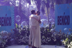 Os painéis de led com imagens do casal deram identidade e significado, transformando o cenário em uma extensão da história deles. Nada ali era aleatório. Tudo tinha intenção.
